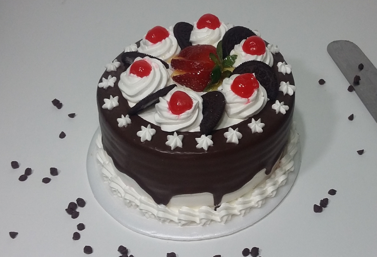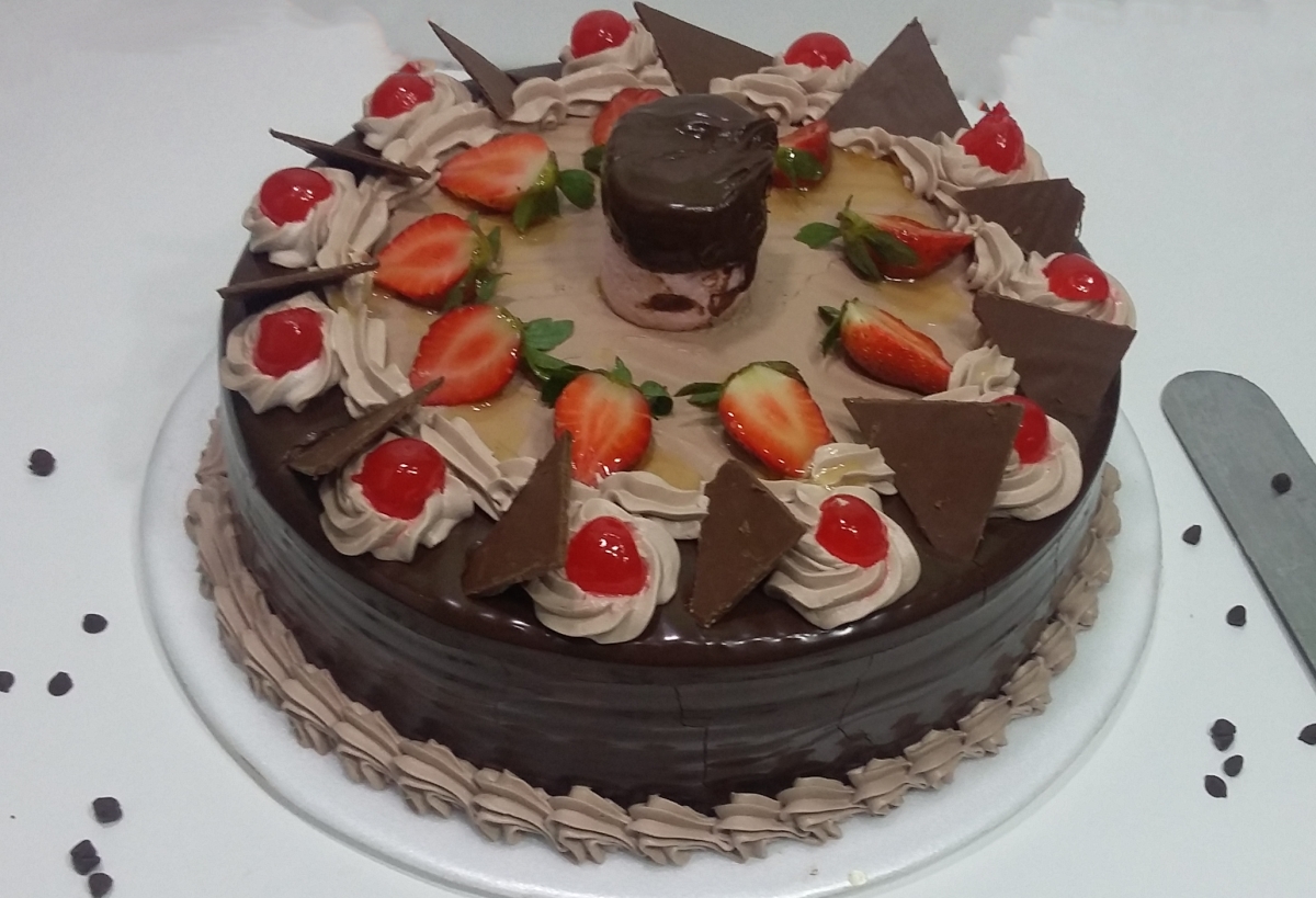 Bizcocho de chocolate relleno de crema y fresas naturales, cubierto con jarabe de chocolate y trozos de chocolate.