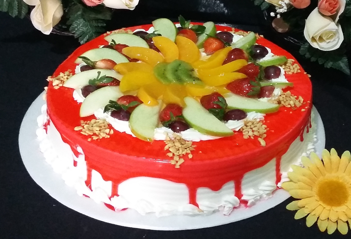 Bizcocho de vainilla relleno con mermelada de melocoton y fresas, cubierto con jarabe especial, decorado con frutas.
