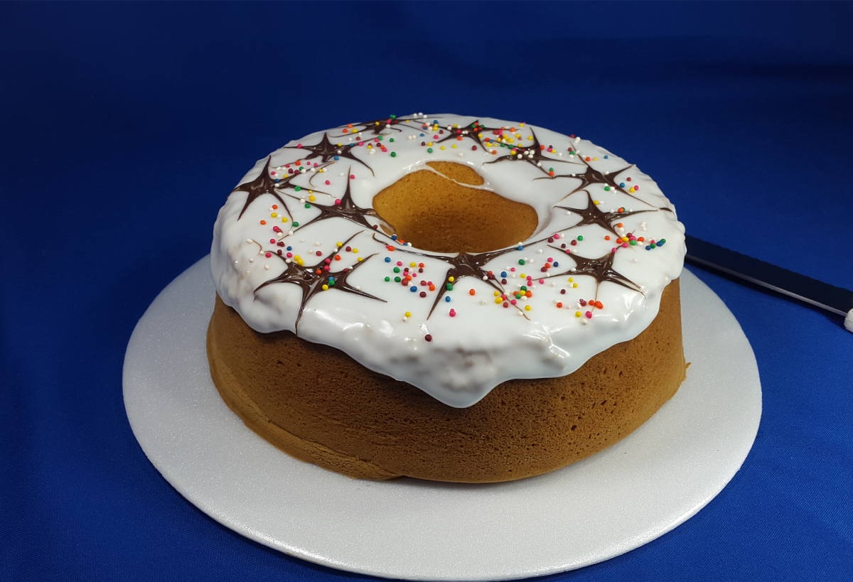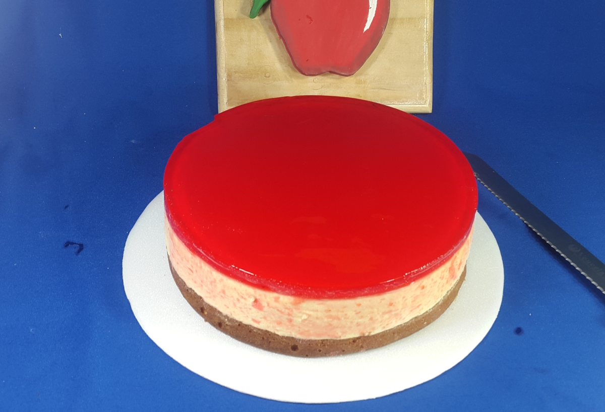 Bizcocho de vainilla con crema bávara cubierto con una capa de gelatina. Pregunta por nuestra variedad de diseños.