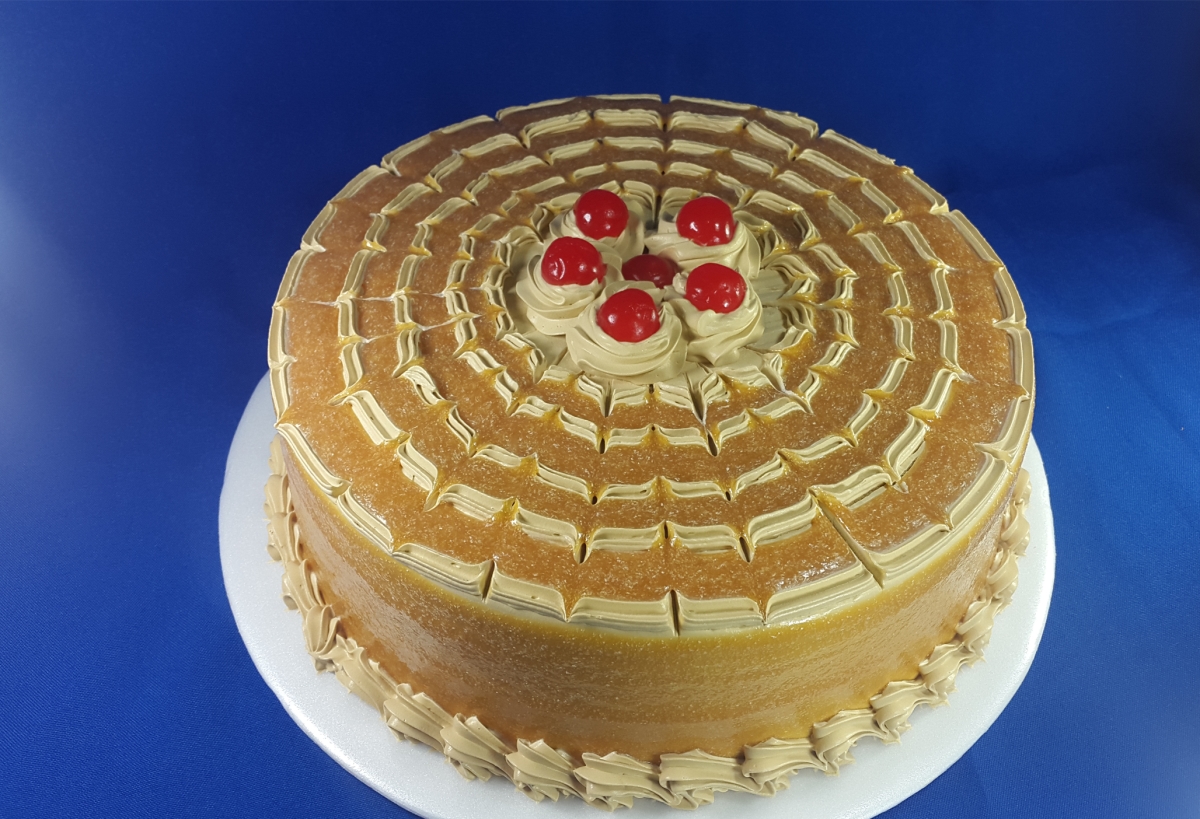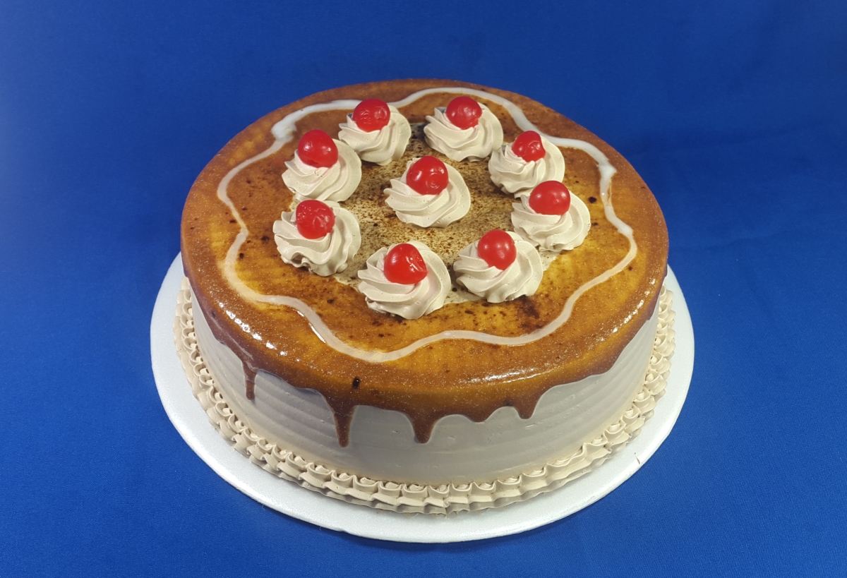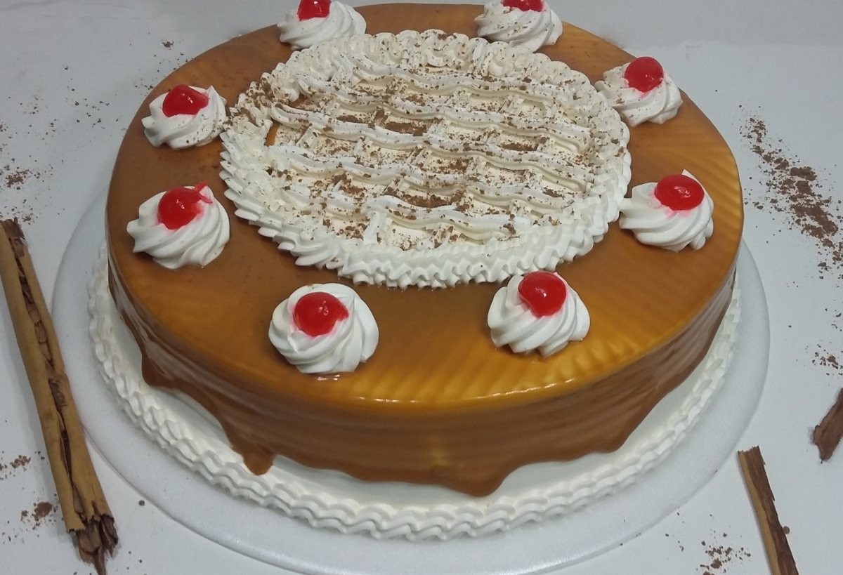 Bizcocho de vainilla relleno de cajeta, cubierto con una capa de crema de vainilla, cajeta, tres jarabes de leche y cerezas.