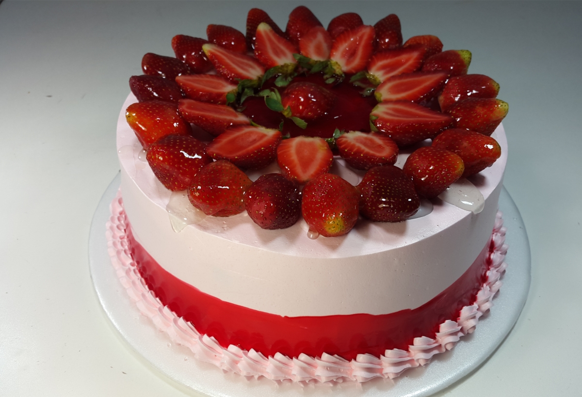 Bizcocho de vainilla con dos rellenos de mermelada de fresas naturales, cubierto con jarabe de fresa.