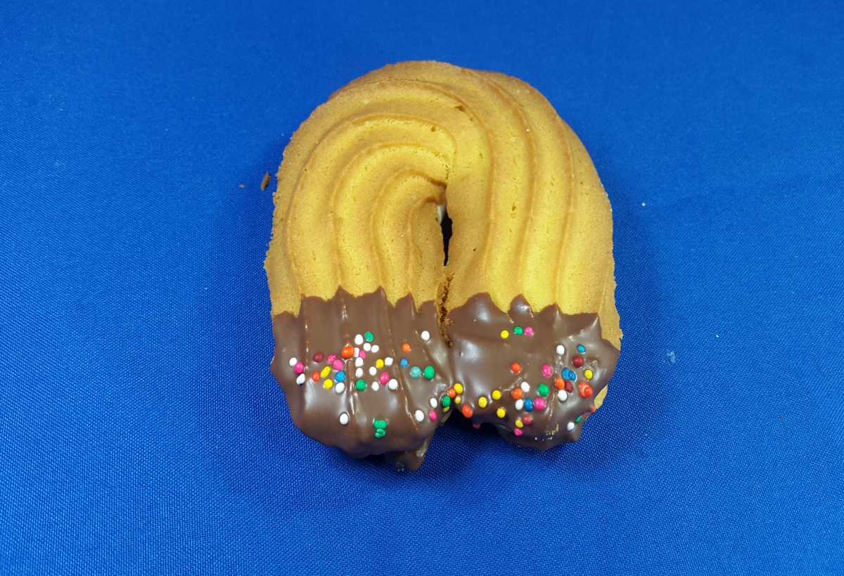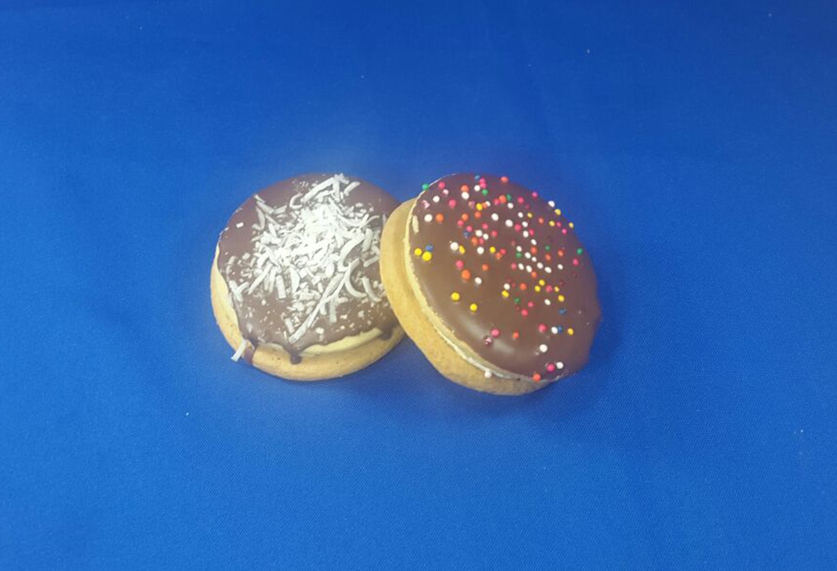 Galletas con relleno de mantequilla, cubierta de chocolate, y decorada con anicillos, o coco rallado y manía