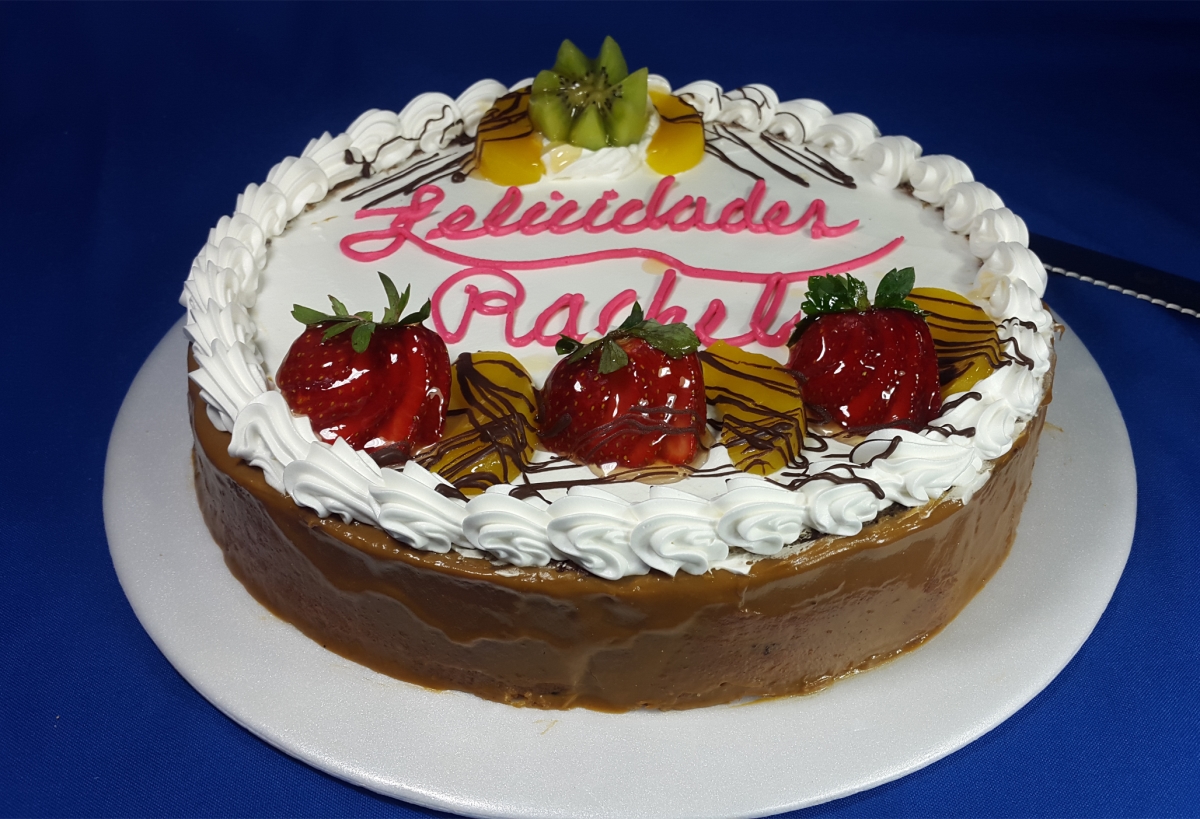 Bizcocho de vainilla, cubierto con capa de crema dulce de leche adornado con distintos diseños que incluyen cerezas.